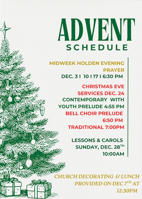 Services at 8:30 a.m. Sunday (Rise Worship with guitars and pianos) and 11:00 a.m. (Traditional worship with organ)